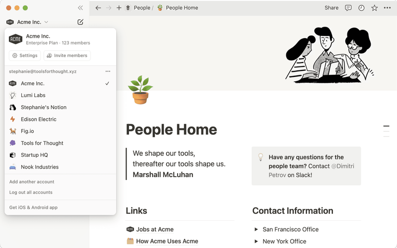 Everything you do in dicehub takes place in a workspace. It's your virtual home to organize information and create exactly the way you want — as just one person, together as a team, or across a whole company. Expand, edit, and mold it to fit your needs 🏠