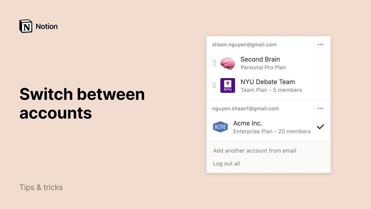 By default, your workspace switcher will display all the workspaces associated with your email address. But you may prefer to use your personal email with your personal workspaces, and your work email with your team workspaces.